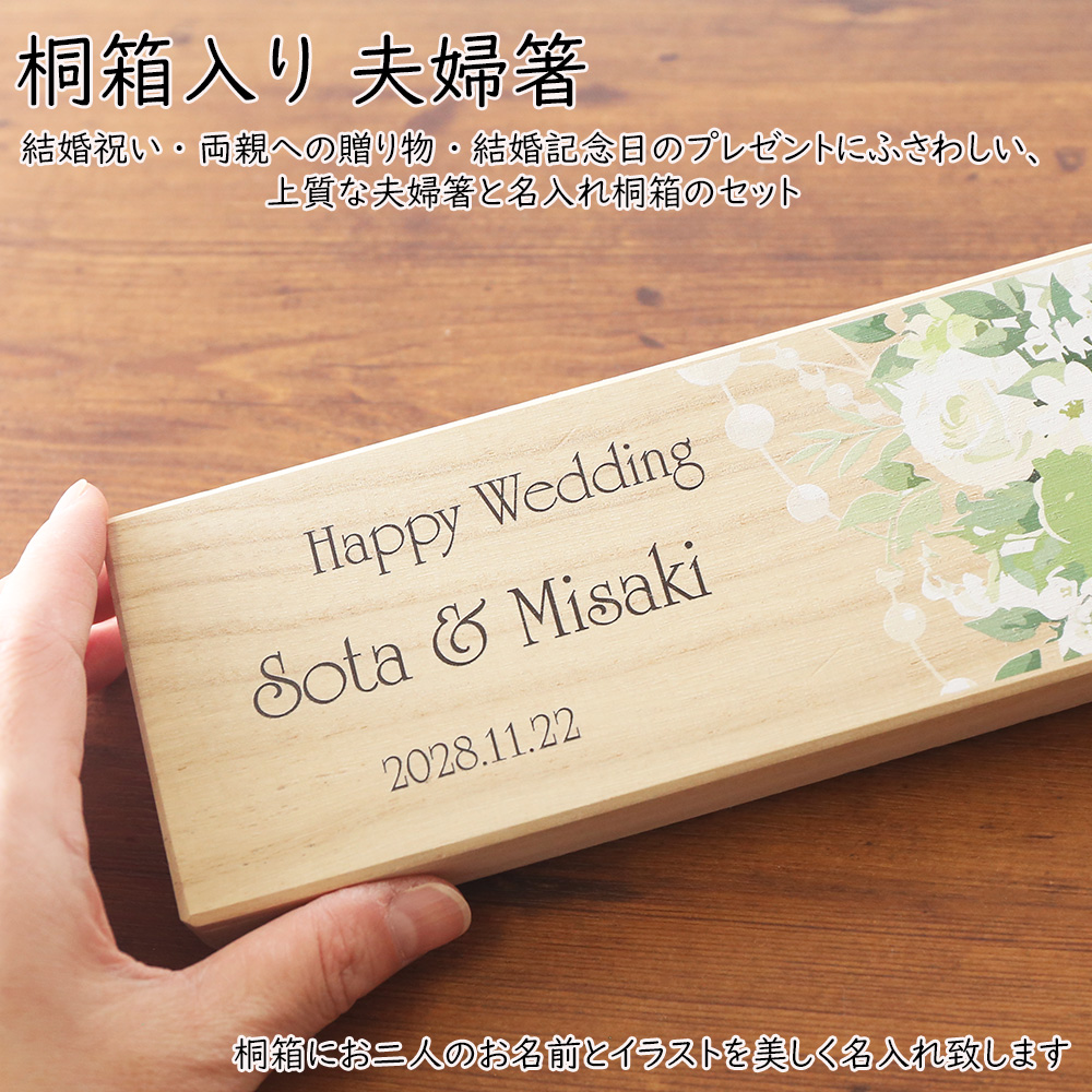 結婚祝い・両親への贈り物・結婚記念日のプレゼントにふさわしい、上質な夫婦箸と名入れ桐箱のセットです。